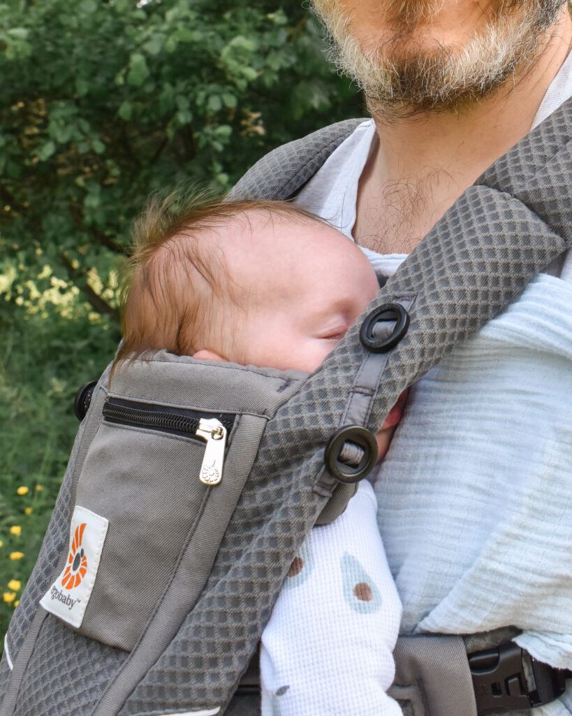 We chose the Omni Breeze as it is the most breathable model Ergo Baby have, and we knew we would be using it mostly in the summer. Even though The Husband and I are vastly different sizes, we both found the Omni Breeze comfortable, and can adjust it to suit our different frames. The Ergo Baby comes with a built-in sun shade (that will also withstand light rain), and has a detachable zip pocket and reflective strips.