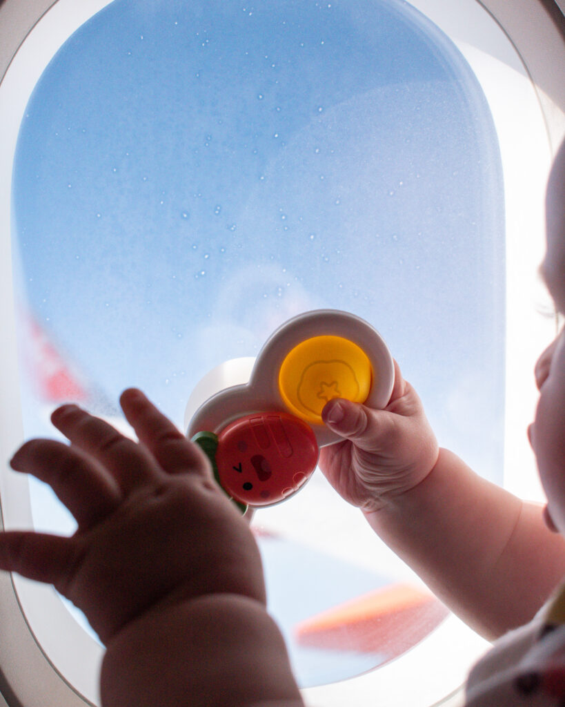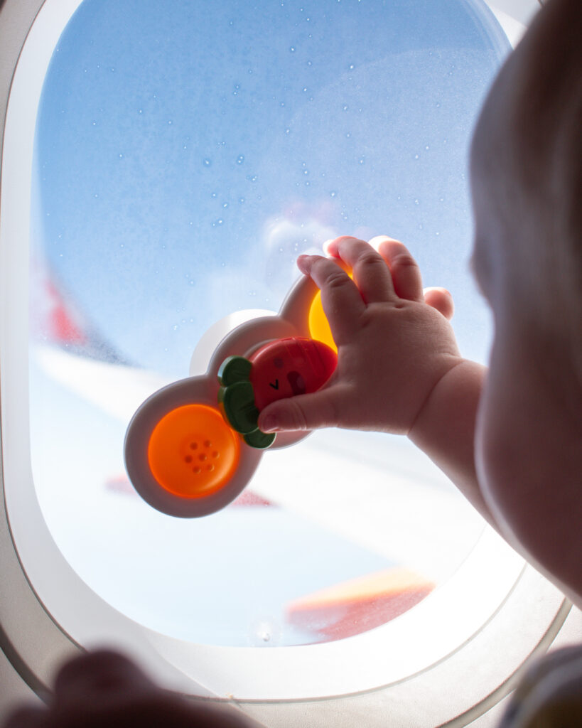 Choose the right toys – in addition to The Baby’s favourites, before his first flight we also bought him this sensory toy, which proved to be perfect for having multiple textures and ways to explore, and possible to hang off the seat in front. It has become a firm favourite, along with the spinners we (and seemingly everyone else!) got. In addition to sticking to the plane window and fold down tray table, they are also now his nightly bath toys! Likewise, these super packable suction toys have been very popular at home and on holiday, as have these versatile silicon animals.