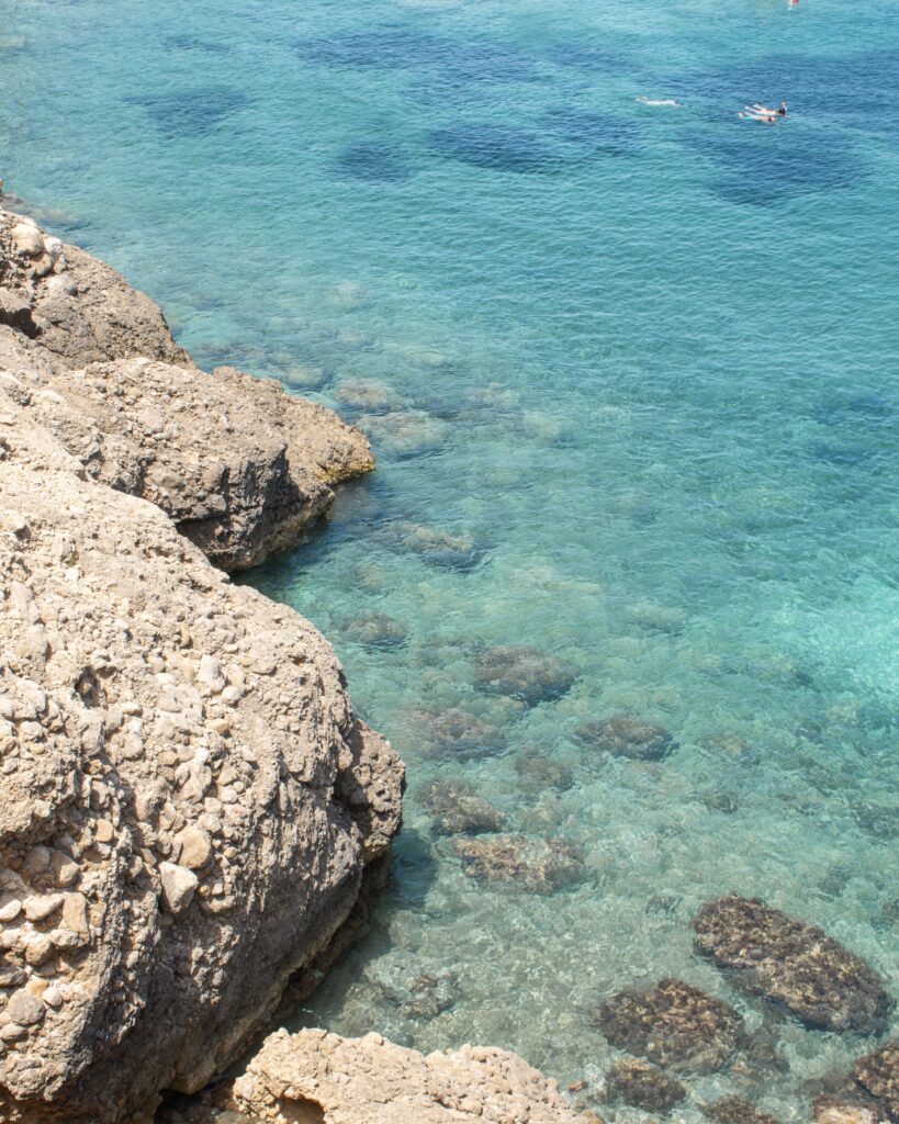 Cala Mastella – a beautiful tranquil gem of a bay, with one of Ibiza’s smallest beaches. The famous fish restaurant here books out weeks in advance (more below!), but if you come in the morning before the 12pm lunchtime opening, you are likely to have the cove almost to yourself, even in the height of the summer. Be sure to bring your water shoes and snorkelling gear. The rocky sea bed keeps the water crystal clear and makes for excellent snorkelling. This really is an idyllic spot.